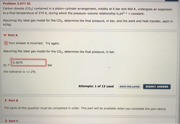 A cylinderpiston contains carbon dioxide at 1 MPa 300C with a volume of 200 L. Carbon dioxide CO2 contained in a pistoncylinder arrangement initially at 6 bar and 400 K undergoes an expansion to a final temperature of 280 K during which the pressurevolume relationship is pV12 constant. Carbon dioxide CO2 contained in a pistoncylinder arrangement initially at 6 bar and 400 K undergoes an expansion to a final temperature of 280 K during which the pressurevolume relationship is pV11 constant.