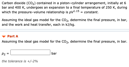 . Carbon dioxide CO 2 contained in a piston-cylinder arrangement initially at 6 bar and 400 K undergoes an expansion to a final temperature of 298 K during which the pressure-volume relationship is. 6b Carbon monoxide CO contained in a pistoncylinder arrangement. Determine the work done during the process.